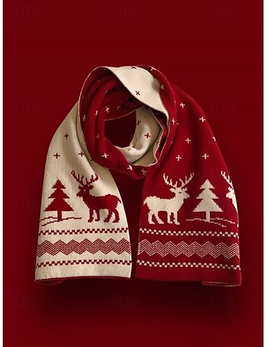 cachecol de malha feminino com estampa de rena e árvore de natal em vermelho e branco, acessório aconchegante de inverno para celebrações de feriados