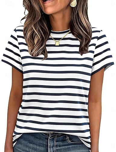 Mulheres Camiseta T-shirt Listrado Moda Clássico Casual Manga Curta Gola Redonda Tops regulares Diário Para Noite Final de semana Preto Branco Vinho Azul Real Café Verão Primavera