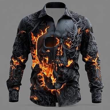 Camisa de Fantasia Masculina Esqueleto Chama Camisa de Botão Camisa de Manga Longa Estilo Punk Gótico Escuro Férias ao Ar Livre Verão Primavera Gola Caída Camisas Impressão 3D Preto