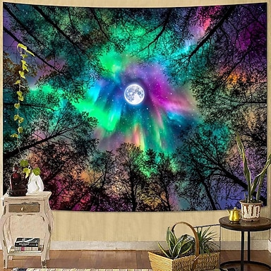 Tapeçaria de parede com aurora boreal, lua cheia, floresta, estética galáxia, céu noturno para quarto, sala de estar, sala de ioga e espaço de meditação.