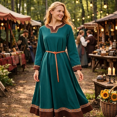Retro Vintage Medieval Renascentista Longo Vestidos Manga Comprida Viking Fantasia Mulheres Fantasia Dia Das Bruxas Carnaval feira renascentista LARP Festa Temática Retro Adulto Vestido Cinto