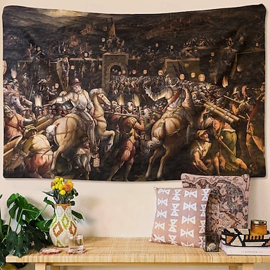 Tapeçaria de parede renascentista com batalha noturna, cerco a uma fortaleza, cavaleiros a cavalo e soldados com tochas. Estilo pintura a óleo antiga, ideal para decoração de salas de estudo,