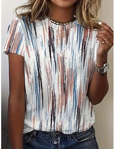 Mulheres Camiseta Imprimir Gráfico Listrado Boêmia Havaiana à moda Manga Curta Gola Redonda Tops regulares Diário Azul Rosa Laranja Verde Verão Primavera