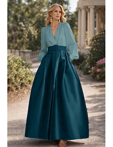 Linha A Longo Vestidos de cocktail Vestido formal Elegante Bloco de Cor Brilhante Manga Longa Decote V Festa de Jardim Casamento Bolsos Tafetá Cetim Elástico com Pregas Bolsos