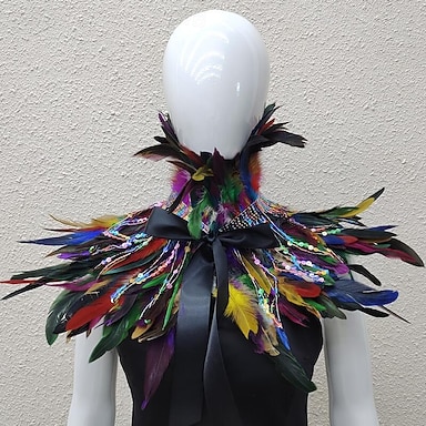 Carnaval 2026 - Acessórios de Samba do Carnaval do Rio - Capa de Pena Arco-Íris Feminina com Franjas de Lantejoula Xale Colorido de Pena com Laço de Cinta