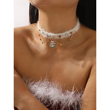 Colar choker natalino feminino, em pelúcia e liga metálica, com pingente de estrela vermelha e dourada, árvore de Natal com strass, acessório perfeito para festas de fim de ano.