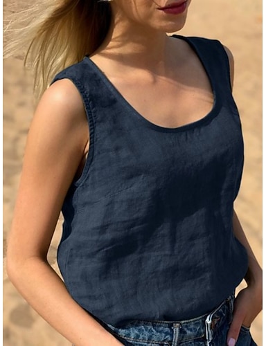 Mulheres Colete de algodão e linho Linho de algodão sintético Côr Sólida à moda Casual Sem Manga Scoop pescoço Tops regulares Diário Azul Marinha Verde Verão Primavera