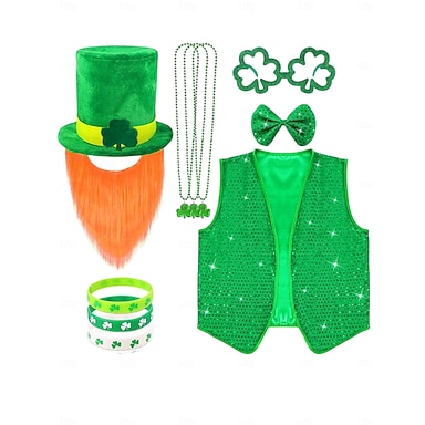 Chapéu verde de duende para o Dia de São Patrício, barba, colete, colar e gravata borboleta para homens. &Conjunto de pulseiras – look festivo completo para as comemorações do Dia de São Patrício.