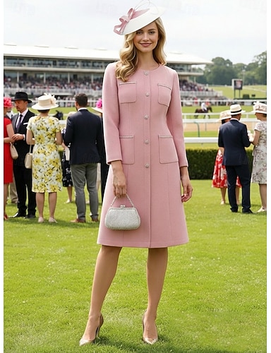 Vestido de Festa Comprimento de Joelho Sheath Column Vestido de Cocktail Vestido de Convidada de Casamento Vestido da Mãe da Noiva Manga Longa Gola Redonda Elegante Vintage Formal com Botões