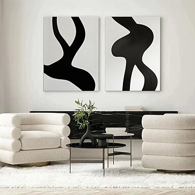 Conjunto de pinturas a óleo feitas à mão em preto e branco, com 2 quadros abstratos em preto e branco, estilo galeria de arte para parede, em tons de bege, minimalistas e com linhas.