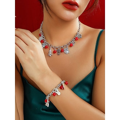 Conjunto de colar e pulseira natalina feminina com pingentes - corrente prateada com contas vermelhas, floco de neve, árvore e presente, joias festivas para festas e presentes.