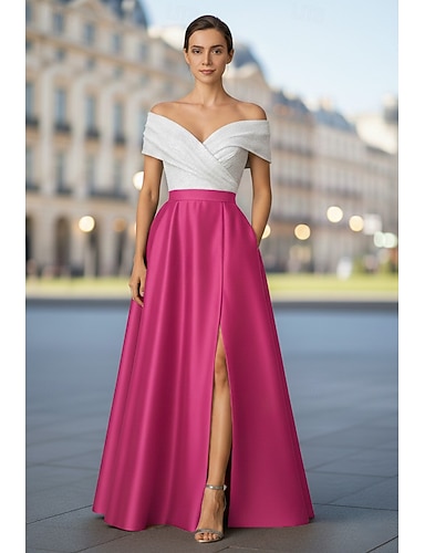 Linha A Longo Vestidos de noite Vestido de Baile Vestido formal Elegante Sedoso Sem Manga Ombro a Ombro Casamento Formal Bolsos Cetim Paetês com Pregas Fenda