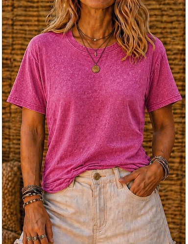 Camiseta feminina 100% algodão, estilo vintage, lavagem especial, moderna e elegante, manga curta, gola redonda, ideal para o dia a dia, praia, nas cores rosa, vermelho, azul, verde-grama, preto e laranja, perfeita para o verão e primavera.