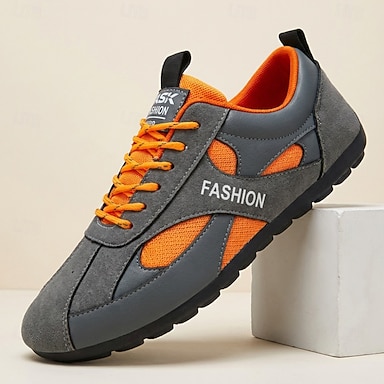 Tênis esportivo masculino respirável com cadarço, nas cores cinza e laranja, ideal para corrida, fitness e um estilo de vida ativo.