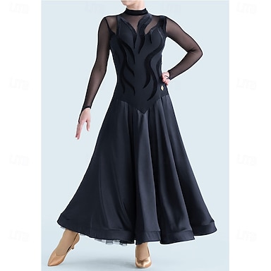 Vestido de dança de salão feminino, manga longa, malha, valsa, tango, competição latina, vestido de performance, elegante saia preta esvoaçante com design de corpete transparente