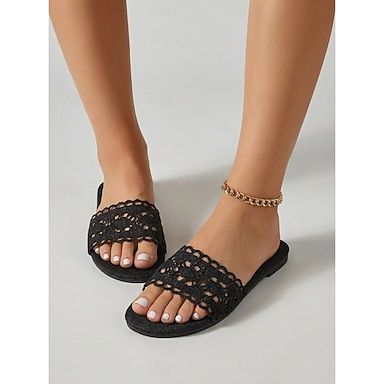 Sandálias rasteiras femininas de crochê creme com renda - elegantes chinelos com bordado floral para férias em hotéis de luxo e escapadelas na praia. &relaxamento em um resort de verão