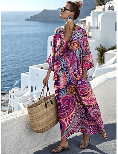 Vestido Midi Feminino V Neck Kaftan Leve Solto Ajuste A Linha Casual Saindo Solto Gráfico Floral Paisley Manga Longa V Neck Marinho Rosa Vermelho Azul Outono