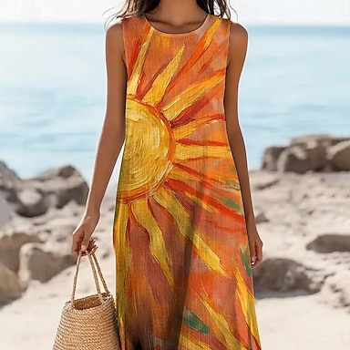 Mulheres Vestido midi Linho de algodão sintético Vestido de turno Vestidos Para o Verão Vestido casual Vintage Diário Ao ar livre Férias Normal Floral Sem Manga Gola Redonda Laranja Verão Primavera