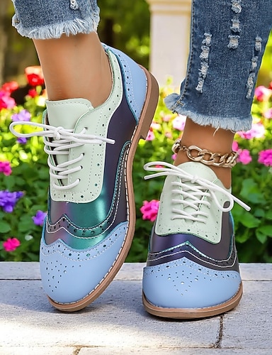 sapatos oxford multicoloridos femininos, design retrô wingtip com painéis verdes, rosa e roxos, brogues casuais com cadarço para moda e uso diário
