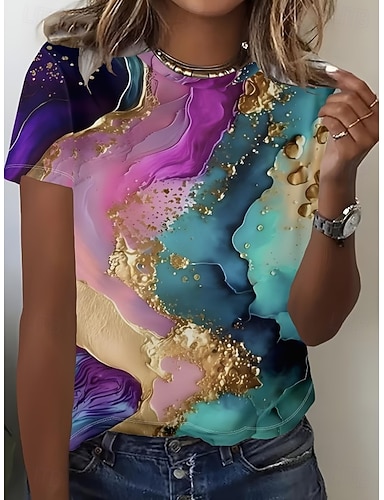 Mulheres Camiseta Imprimir Âmbar Gráfico Vintage à moda Clássico Manga Curta Gola Redonda Tops regulares Diário Azul Marinha Azul Real Roxo Dourado Verde Verão Primavera
