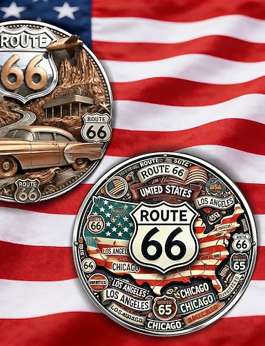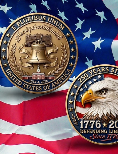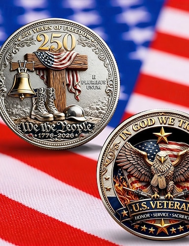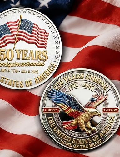 Moeda comemorativa do 250º aniversário dos EUA, ostentando motivos patrióticos de águia e cruz com a inscrição "Deus abençoe a América". Item colecionável.
