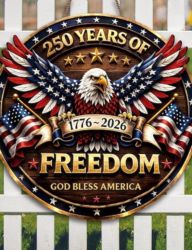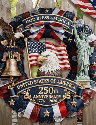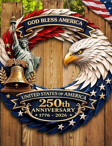 Placa de madeira comemorativa do 250º aniversário dos EUA, decoração patriótica para porta, com a frase "Deus abençoe a América" para o Dia da Independência, com águia, sino da liberdade e Estátua da Liberdade, 1776–2026, decoração para porta de entrada d