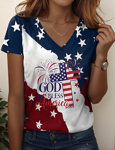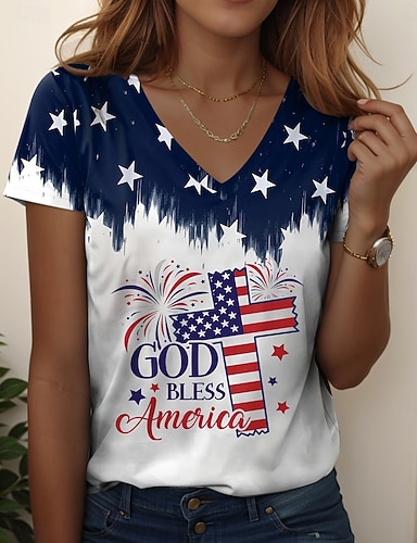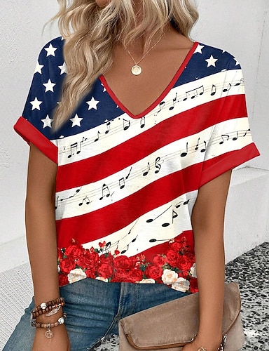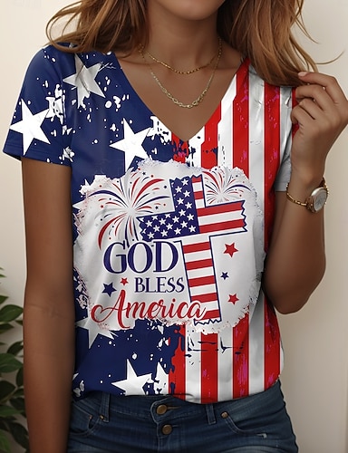 Dia da Independência Americana Mulheres Camiseta Imprimir Gráfico Bandeira Vintage à moda Clássico Manga Curta Decote V Tops regulares Diário Azul Vermelho Verde Verão Primavera