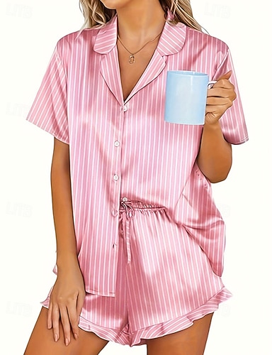 Mulheres Pijamas Loungewear Conjunto de Pijama Moda Casual Conforto Listra Cor imaculada Abotoar Cintura elástica Calção Diário Casa Férias Manga Curta Colarinho de Camisa Roxo Verde Verão Primavera