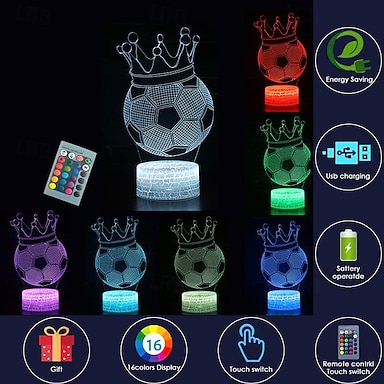 Luminária noturna 3D com ilusão de futebol, 16 LEDs, controle remoto sensível ao toque para mudança de cor, ideal para decoração infantil, presente de aniversário ou para fãs de esportes.