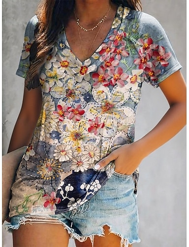 Mulheres Camiseta Imprimir Floral Graffiti Boêmia Vintage Casual Manga Curta Decote V Tops regulares Diário Azul Verão Primavera