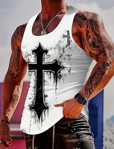 Regata Gráfica Masculina da Bíblia com Cruz Gótica Preta Grande e Efeito de Tinta Roupas de Rua Cristãs Vintage Ajuste Muscular Sem Mangas Casual para o Verão Roupas de Designer