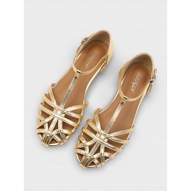 Sandálias femininas douradas com tiras metálicas - elegantes sapatos rasos de tiras para noites em resorts, sandálias confortáveis de verão com tira em T para jantares de férias. &roupa de cruzeiro