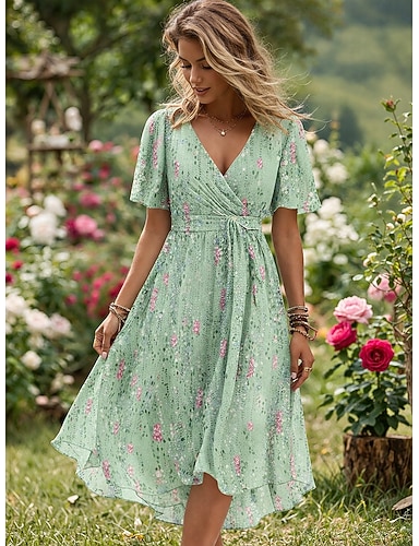 Mulheres Vestido midi Vestido Coquetel Vestido de chiffon Vestido floral Moda Moderno Férias Feriado Festa de Chá Normal Flor Manga Curta Decote V Verde Claro Vermelho Verde Escuro Dourado Verão