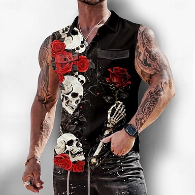 Homens Esqueleto Rosa Caveiras Camisa Social camisa de botão camisa sem manga Sem Manga Estilo gótico escuro Ao ar livre Casual Verão Primavera Aberto para a Lateral Impressão 3D Dois bolsos frontais