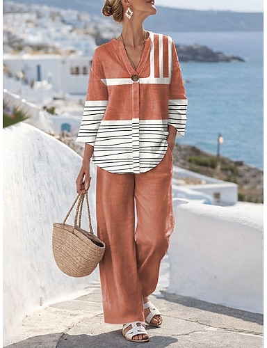 Conjuntos Femininos de Duas Peças Estilo Linho Calças Blusa Bolero Manga 3/4 Decote em V Gráfico Listrado Geométrico Estilo Casual Diário Praia Azul Roxo Laranja Verão Ajuste Regular