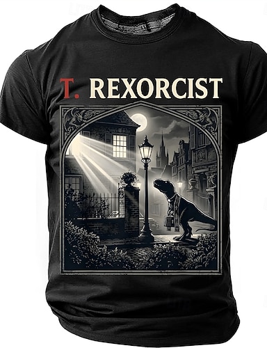 Camiseta masculina T. Rexorcist, paródia engraçada de filme, com silhueta de padre dinossauro T-Rex, estilo gótico/noir de terror, manga curta, casual, ideal para o Halloween, presente de grife,