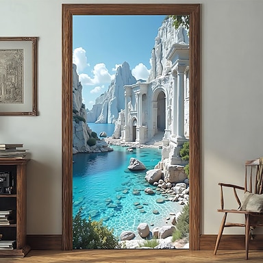 Faixa decorativa de porta com vista para praia mediterrânea em 3D, com arcos de pedra e paisagem oceânica tropical, ideal para entrada, quarto e decoração de casa.