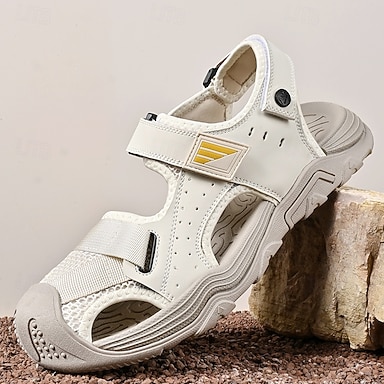 Sandálias brancas masculinas para uso externo, com tiras ajustáveis com fecho de velcro, sola com amortecimento, modelo prático e confortável para viagens e uso diário.