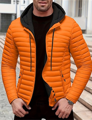 Homens Casaco de inverno Casaco puffer Jaqueta acolchoada Bolsos Poliéster Férias Roupa Diária Encontro Padrão Moda Casual Confortável Térmico / Quente Outono Inverno Cor Sólida / Simples Preto