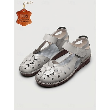 Sapatilhas femininas cinza em couro legítimo de vaca com recortes florais, tira ajustável, costuradas à mão, calçado casual e confortável com sola macia para uso diário, viagens e jardinagem.