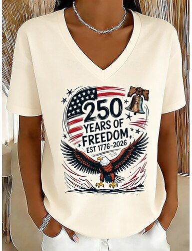 Dia da Independência Americana Mulheres Camiseta Imprimir Gráfico Bandeira Bandeira americana Vintage à moda Clássico Manga Curta Decote V Tops regulares Diário Vermelho Bege Verão Primavera