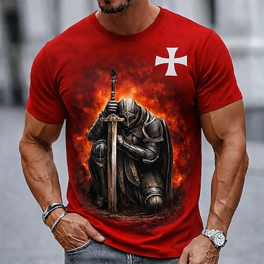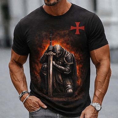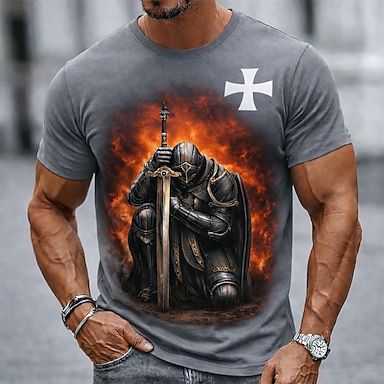 Camiseta masculina com estampa de cavaleiro templário ajoelhado, cruz, guerreiro medieval, fogo, fantasia sombria, estilo gótico streetwear, gola redonda, manga curta, presente de aniversário para