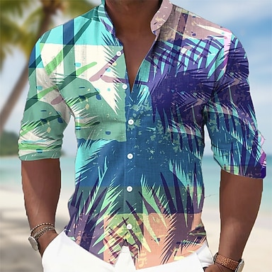 Homens Bloco de cor Folha de palmeira Plantas Tropicais Camisa Social Camisas havaianas Camisa de gola alta Manga Longa Havaiana Casual Férias Primavera Outono Colarinho Mandarim Faixa Impressão 3D