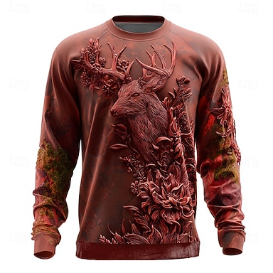 Homens Folha Padrão de alívio Veado Moletom Casual Manga Longa Gola Redonda Férias Festa Presente Azul Vinho Marron Verde Crewneck 3D Todas as Estações Designer S M L XL XXL XXXL