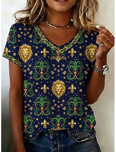 Carnaval Mulheres Camiseta Imprimir Gráfico Vintage Casual Manga Curta Decote V Tops regulares Diário Final de semana Roupas de férias Azul Marinha Verão Primavera