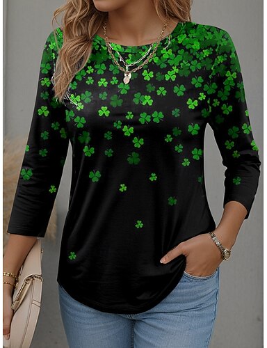 Camiseta Feminina do Dia de São Patrício com Gráfico de Trevo Moda Estilosa Moderna de Manga Longa Gola Redonda Tops Regulares Estampada Diária Fim de Semana Branca Verde Primavera Inverno