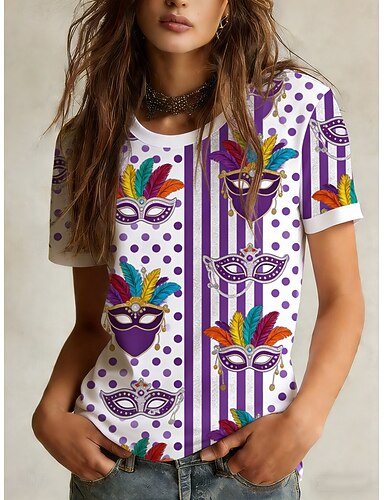 Carnaval Mulheres Camiseta T-shirt Imprimir Gráfico Listrado à moda Clássico Casual Manga Curta Gola Redonda Tops regulares Diário Esportes Para Noite Roxo Verão Primavera