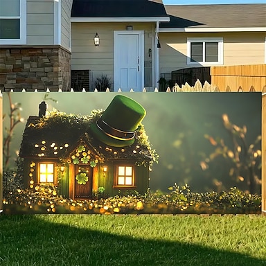 Banner de jardim para o Dia de São Patrício, decoração externa, casa de duende, trevo, moeda de ouro, cobertura de cerca, placa grande para quintal, artigos para festa, painel de fundo para parede.