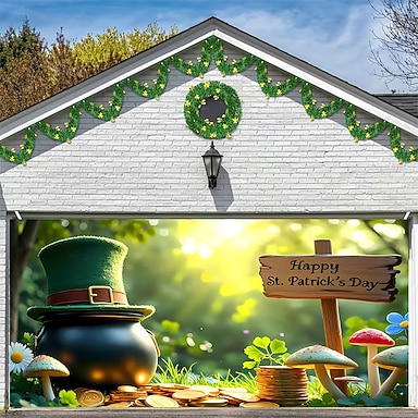 Dia de São Patrício tapeçaria Tampa da porta da garagem Grande pendurado Elfo Chapéu verde Estilo bonito 3D De Festa Exterior Férias Fundos de fotografia Jarda Decoração de casa