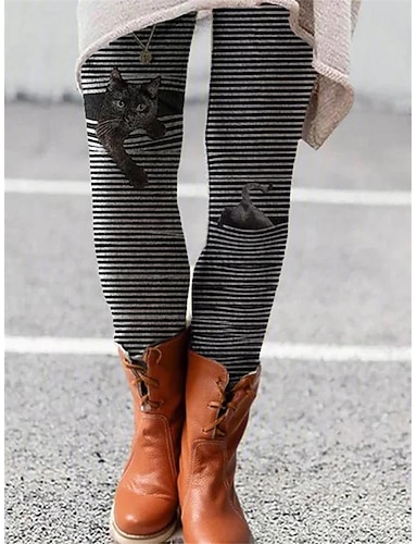 Mulheres Leggings Leggings aconchegantes Moda Roupa de rua Básico Comprimento total Cintura Alta Gráfico Gato Listrado Estampado Tosão Térmico / Quente Confortável Com Stretch Ao ar livre Casual